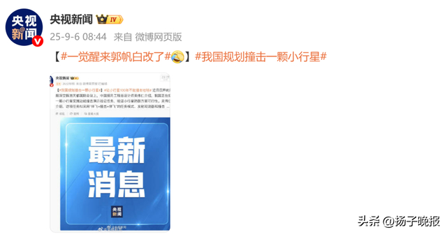 随后,@央视新闻 将该条“我国规划撞击一颗小行星”的动态截图再次发布,并配文“一觉醒来郭帆白改了”。
