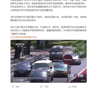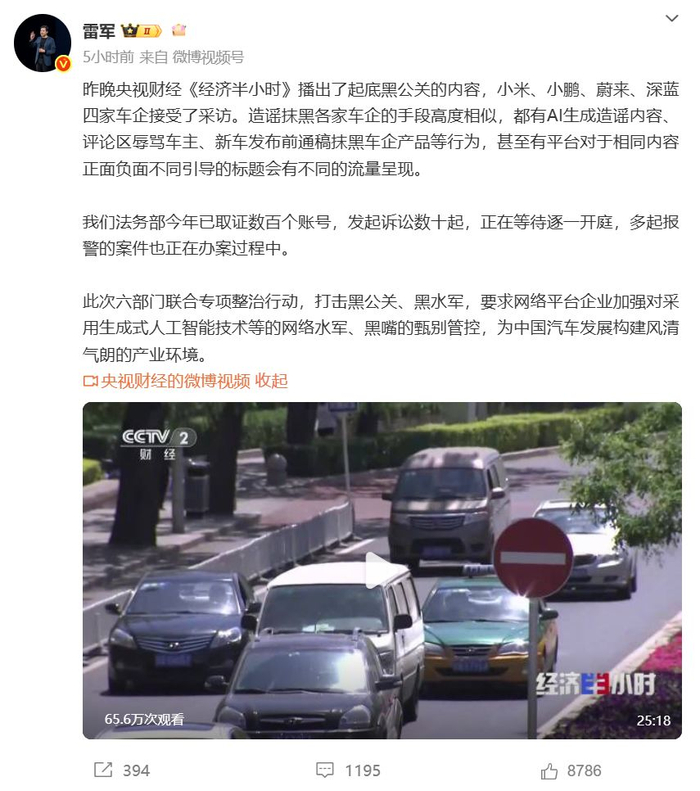 9月13日,小米创办人、董事长兼CEO雷军在微博发文称,昨晚央视财经《经济半小时》播出了起底黑公关的内容,小米、小鹏、蔚来、深蓝四家车企接受了采访。造谣抹黑各家车企的手段高度相似,都有AI生成造谣内容、评论区辱骂车主、新车发布前通稿抹黑车企产品等行为,甚至有平台对于相同内容正面负面不同引导的标题会有不同的流量呈现。