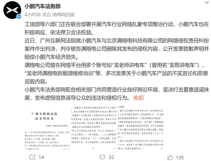 近日,广州互联网法院就小鹏汽车与北京满格电科技有限公司的网络侵权责任纠纷案件作出判决,判令被告满格电公司删除其发布的侵权内容,公开发表致歉声明并赔偿小鹏汽车经济损失。