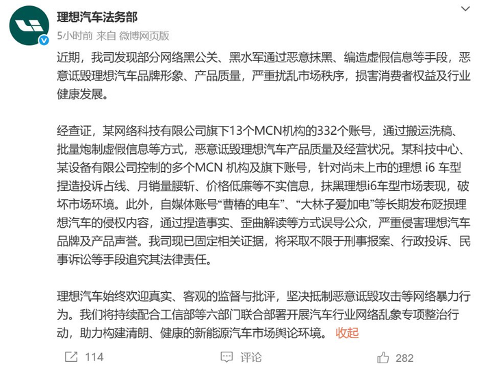 9月11日,理想汽车法务部在微博发文称,近期,我司发现部分网络黑公关、黑水军通过恶意抹黑、编造虚假信息等手段,恶意诋毁理想汽车品牌形象、产品质量,严重扰乱市场秩序,损害消费者权益及行业健康发展。