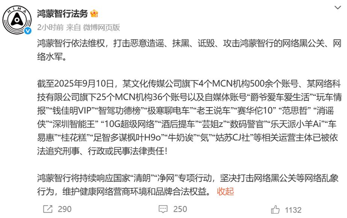 9月10日,鸿蒙智行法务在微博发文称,鸿蒙智行依法维权,打击恶意造谣、抹黑、诋毁、攻击鸿蒙智行的网络黑公关、网络水军。