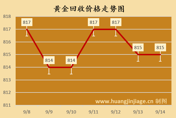 今日黄金回收价格每克815元,铂金回收价格每克285元,钯金回收价格每克237元,18K金回收价格每克588元,白银回收价格每克7.4元。(黄金行情是波动的,以结算价格为准。)