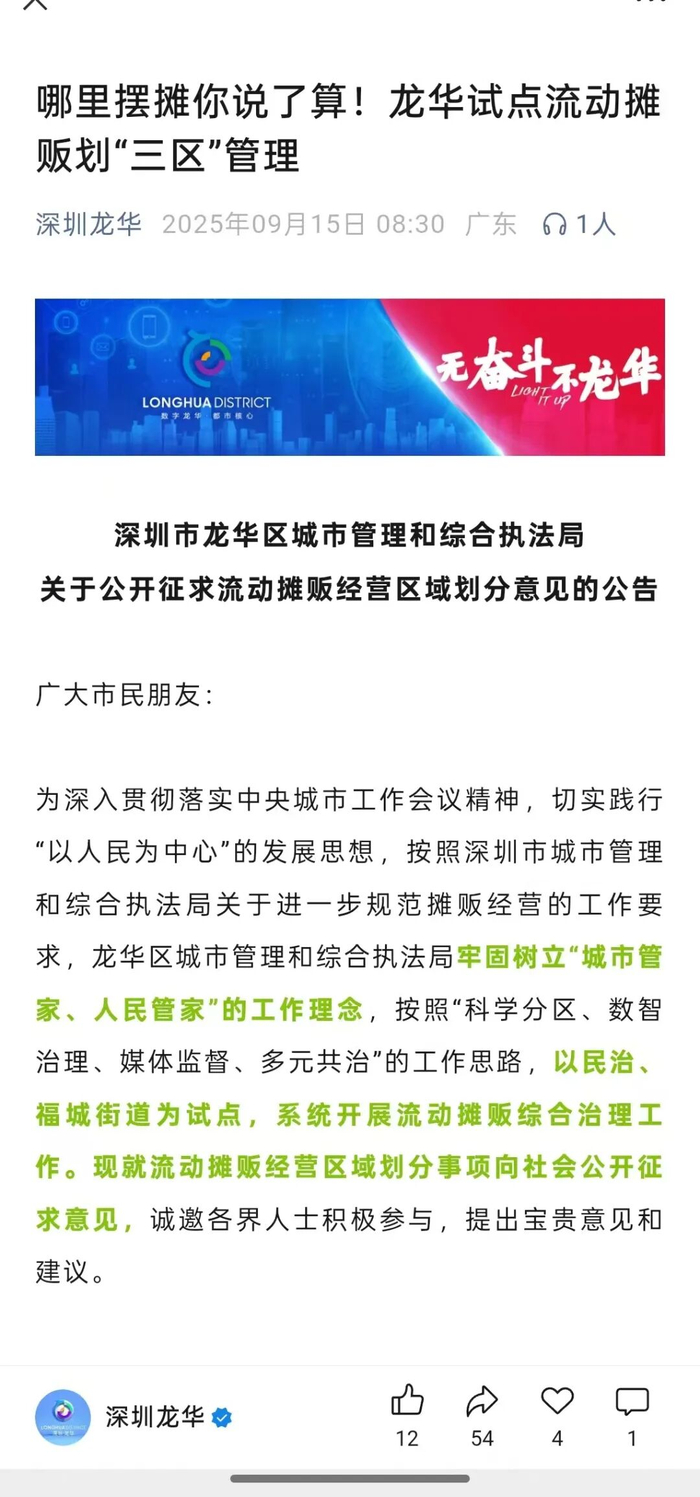 为确保流动摊贩经营区域划分科学合理,符合市民需求和城市发展实际,龙华区主动向社会公开征求意见。自2025年9月15日起至2025年9月19日,市民可通过扫描公告中提供的二维码,反馈对流动摊贩经营区域划分的意见和建议。