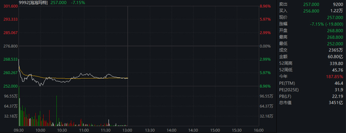 周一(9月15日),泡泡玛特再度大幅杀跌,最低跌至252港元/股,为8月5日以来最低水平,且较此前的纪录高位已经回调超过25%。