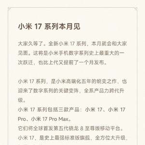 9月15日,小米集团合伙人、总裁卢伟冰在社媒上发文,官宣全新小米17系列将于本月与公众见面。