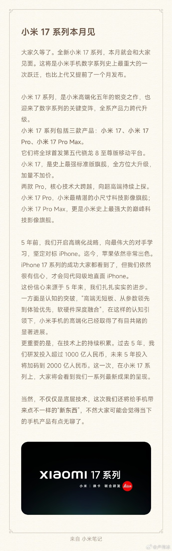 小米官宣,本月发布17系列!卢伟冰透露包含3款产品,雷军:全面对标iPhone