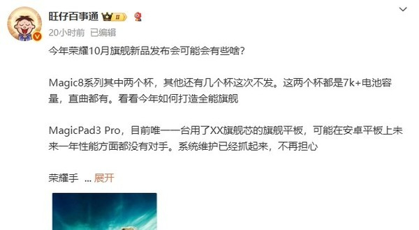 除手机外,荣耀10月还可能推出MagicPad 3 Pro平板,定位“至强安卓平板”。据爆料,该平板搭载旗舰级芯片,提供16GB LPDDR5X运存和1TB存储选项,并内置12450mAh超大电池,支持66W快充。