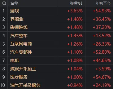 板块方面,游戏、猪肉、汽车等板块涨幅居前,贵金属、文化传媒等板块跌幅居前。