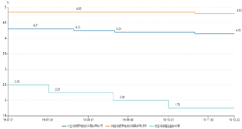 2019年7月30日——2019年10月30日,全球经济增长乏力及中美贸易摩擦持续的背景下,美联储累计降息75bps;国内五年期LPR累计降息10bps。