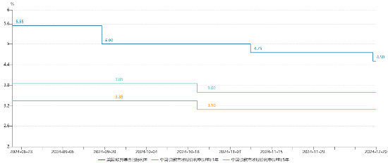 2024年9月18日——2024年12月18日,美国开启货币宽松周期,美联储累计降息100bps, 国内五年期LPR累计降息25bps。