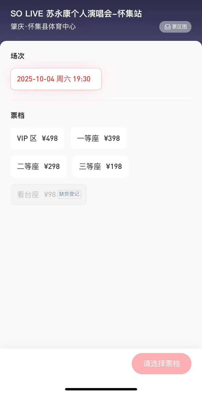 界面新闻查阅发现,除了温州,苏永康“So Live”2025巡回演唱会广东怀集站也将于10月4日举办,9月8日开启售票,票价98元到498元不等。目前98元的看台票已经售罄,演唱会举办地点在肇庆怀集县体育中心。此前,9月8日下午,“SO LIVE 苏永康个人演唱会—怀集站”新闻发布会在怀集新世界大酒店召开。