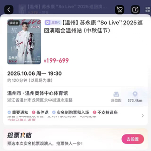9月16日上午,界面新闻查询售票平台大麦网,相关信息显示,苏永康“So Live”2025巡回演唱会温州站(中秋佳节)将于10月6日在温州奥体中心体育馆举办,票价为199元至699元不等,目前已经售罄,想购票的粉丝只能申请缺货登记。大麦网页面显示,有6395人登记想看。