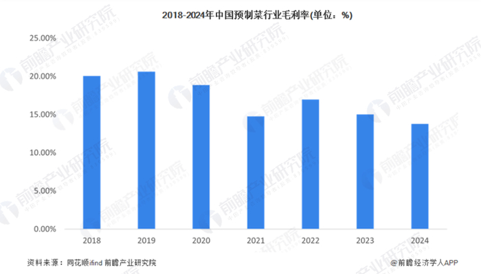 相反,中国预制菜上市公司毛利率整体呈下滑趋势,从2018年的20.07%波动降至2024年的13.79%。