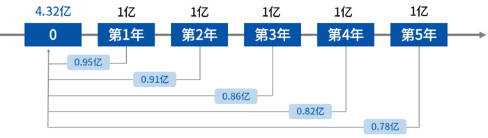 例如,假设一条剩余经营期限为5年的高速公路,预计未来每年能够产生的运营现金流为1亿元。折现率为5%,即第二年的1亿元等于现在的0.95亿元(计算公式为1/(1+5%))。以此类推,最后加总计算出来的当前价值为4.32亿元。