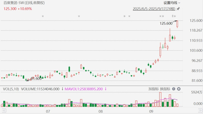 格隆汇9月17日|百度集团(9888.HK)大涨近11%报125.6港元,创2023年10月以来新高。隔夜美股市场百度大涨7.81%报123.79美元,折算成港股市场价格为124.88港元/股。