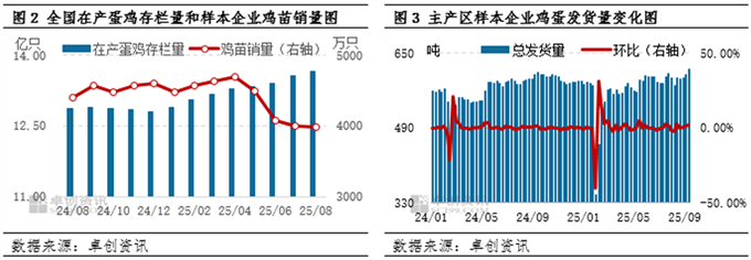 供应侧,根据前期鸡苗销量以及老母鸡出栏量数据进行推算,9-10月在产蛋鸡存栏量或高位微降,鸡蛋供应仍较充足。