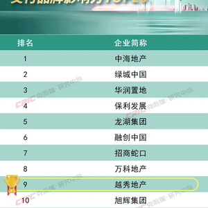 近日,克而瑞发布《2025上半年中国房企交付品牌影响力TOP20榜单》,越秀地产凭借长期稳定的高品质交付表现成功入选第九。此次上榜,既是权威机构对越秀地产交付实力的肯定,也彰显出公司在行业迈入“品质时代”的长期核心竞争力。