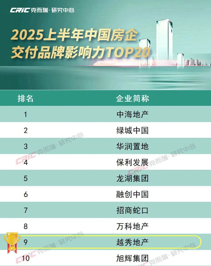 喜报丨越秀地产荣获克而瑞2025上半年中国房企交付品牌影响力TOP9