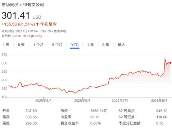 周三,甲骨文股价下跌1.71%,报301.41美元,已较上周三创下的历史高点回落逾10%,不过今年仍累计上涨逾80%。