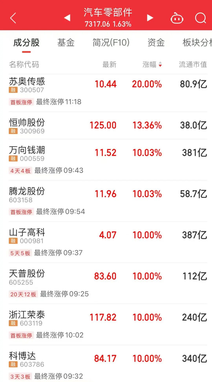 其中,汽车零部件板块掀起涨停潮,万向钱潮、腾龙股份等个股涨停。两大千亿市值龙头股拓普集团、三花智控联手大涨,盘中股价均创历史新高。