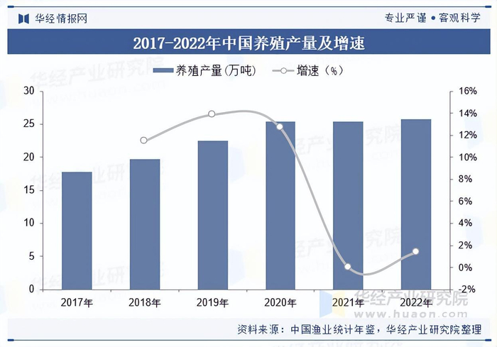 大黄鱼为名贵的可食用经济鱼类,为中国传统四大海产渔业种类之一,分布于西北太平洋区,包括中国、日本、韩国、越南沿海,在中国分布于黄海南部、东海。近年来,我国的黄花鱼养殖产量呈恢复性增长趋势,2022年的中国大黄鱼养殖产量为25.77万吨,同比增长1.36%,居于我国海洋鱼类养殖产量的首位。