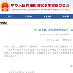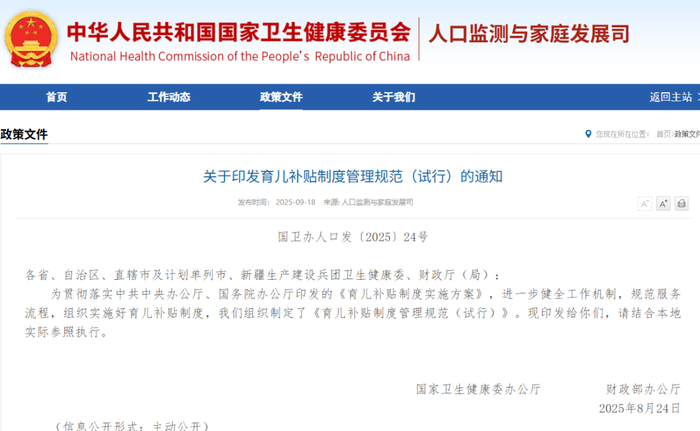 9月18日,国家卫生健康委办公厅和财政部办公厅联合发布关于印发育儿补贴制度管理规范(试行)的通知,旨在进一步健全工作机制,规范服务流程,组织实施好育儿补贴制度。
