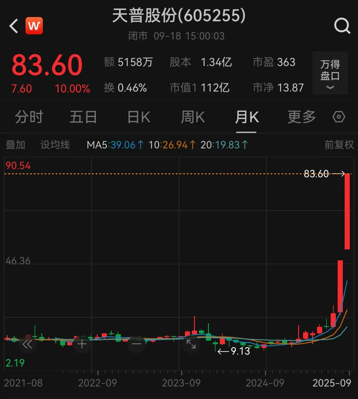 9月18日,停牌核查后复牌的天普股份(605255.SH)再度一字涨停,报83.6元/股,总市值达到112亿元。这是该股自8月22日以来的连续第12个涨停板,累计涨幅超过213%。