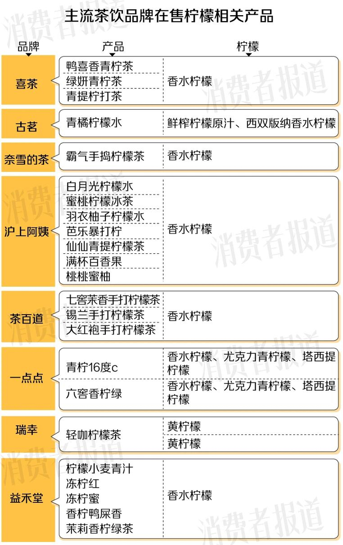 记者梳理主流茶饮品牌当前柠檬相关产品后发现,目前大多数茶饮品牌推出的柠檬饮品基本都使用香水柠檬。