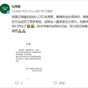 9月19日,知名连锁餐饮品牌云海肴联合创始人、董事长赵晗因突发心梗,经医治无效在9月18日于昆明同仁医院病逝,年仅40岁。
