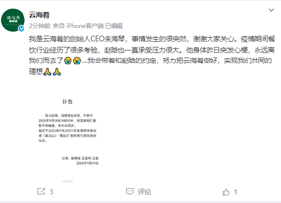 云海肴创始人、CEO朱海琴在云海肴官方微博发文确认了这一消息,并贴出了赵晗家属发布的讣告。讣告显示,赵晗遗体告别仪式定于9月20日11时在昆明市殡仪馆“慎远厅”举行。