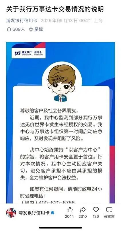 对此,浦发银行信用卡中心发布了《关于我行万事达卡交易情况的说明》。其中提到,“近期,浦发银行信用卡中心监测到部分我行万事达无价世界卡发生未经授权的交易,已经与万事达卡组织第一时间启动应急响应,及时发现并阻断了风险。针对本次情况,浦发银行信用卡中心主动回应客户关切,避免客户承担不应由其承担的损失,全力维护客户合法权益”。