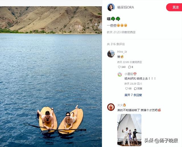 杨采钰发布多张印尼度假照,包括与丈夫的桨板合照、游艇派对等场景,配文“嘿,一些些开心”。其丈夫主动在评论区回应网友质疑,确认身份并互动示爱,首次正面公开夫妻关系。