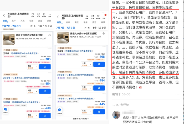 还有下面这位小红书网友,他是钻石用户,同事为普通用户,他们两个人通过携程,同一时间,查询同一家酒店,作为普通用户的同事查到的价格比他便宜。