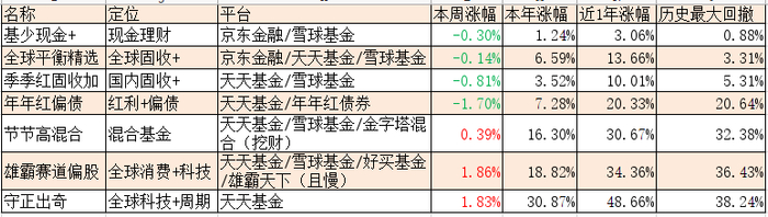 本周红利、转债、金融等跌幅较大,实物黄金也有一定下跌,拖累稳健组合表现,但芯片为主的科技类指数较为强势,美股也再创新高,推动积极组合继续上涨。