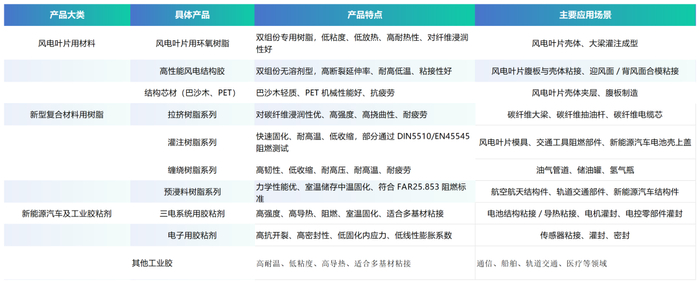 公司是国家级高新技术企业,围绕环氧树脂、聚氨酯、丙烯酸酯和有机硅等高性能热固性树脂材料,形成风电叶片用材料、新型复合材料用树脂、新能源汽车及工业胶粘剂三大系列产品,为风电、新能源汽车、储能等领域提供新材料综合解决方案。