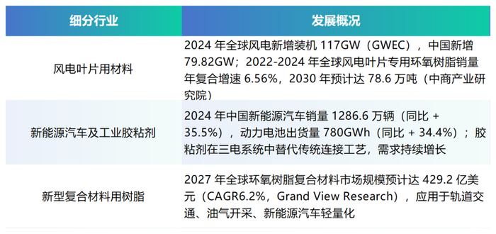 •风电叶片用环氧树脂:2022-2024 年销量全球第一(中国石油和化学工业联合会)。