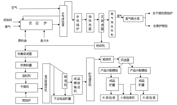 2、始于1944年炉法炭黑,包括油炉法、气炉法。此种生产方法设备体积变小,产量增大,但质量不如槽法炭黑。