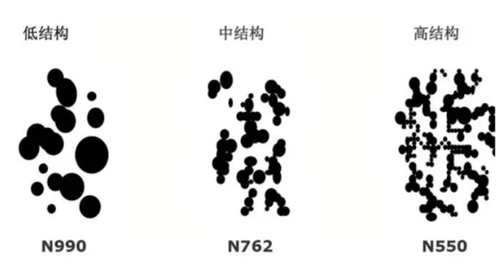 炭黑的结构性是以炭黑粒子间聚成链状或葡萄状的程度来表示的。由凝聚体的尺寸、形态和每一凝聚体中的粒子数量构成的凝聚体组成的炭黑称为高结构炭黑。常用吸油值表示结构性,吸油值越大,炭黑结构性越高,容易形成空间网络通道,而且不易破坏。