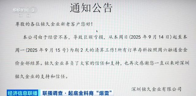 目前已有多家黄金原料供应商在网上发公告,称公司由于经营不善,导致巨额亏损,正在进行清算工作,所有订单存料按照9月13日融通金金价全部结算。