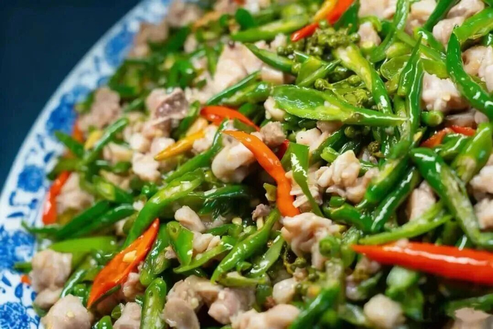 制作时,兔肉需加红苕芡粉和鸡蛋清码味,然后滑油至九成熟,再与大量的青红小米椒、花椒以及多种调料一同烹煮约5分钟,吃起来肉质鲜嫩、麻辣爽口。