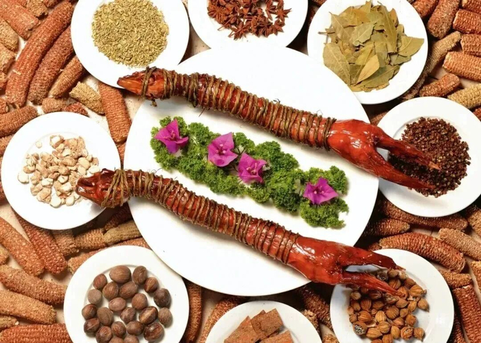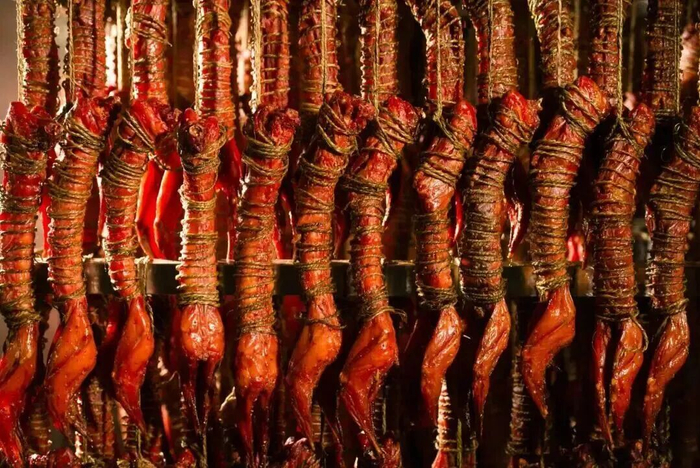 制作上尤为讲究,需经腌、晒、烤、熏、卤等十余道复杂工序,并以麻绳缠绕定型,辅以多种祖传中药材秘制慢成。香料在风干中逐渐渗入肌理,形成独特风味。
