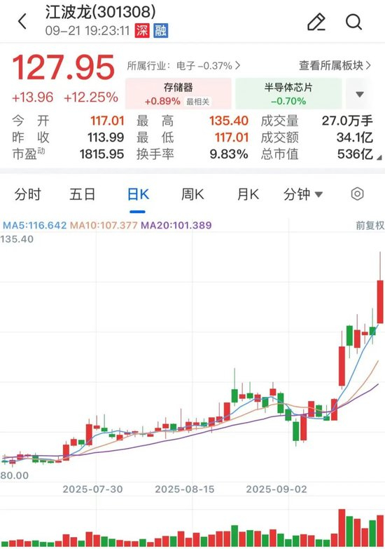 存储模组及产品的江波龙是国内第三方存储模组龙头,拥有行业类存储品牌FORESEE、海外行业类存储品牌Zilia和国际高端消费类存储品牌Lexar(雷克沙)。2024年公司在中国企业级SATA SSD总容量排名中位列第三,已推出多款eSSD、DDR4 RDIMM和DDR5 RDIMM企业级存储产品。江波龙股价周五收盘大涨超12%,最高触及135.4元/股,创历史新高。拉长时间来看,其股价自4月低点迄今累计最大涨幅101.3%。