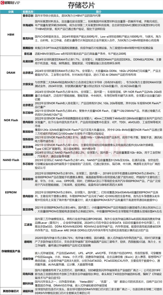 据财联社VIP数据不完全统计,存储芯片的分类主要包括:HBM、DRAM、NOR Flash、NAND Flash、EEPROM、存储模组及产品、其他存储芯片。具体情况见下图: