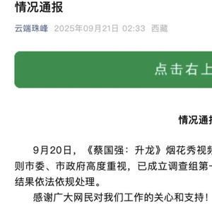 9月21日,“云端珠峰”官方微信发布通报,称《蔡国强:升龙》烟花秀视频在网络发布后,引发网民关注。日喀则市委、市政府高度重视,已成立调查组第一时间赶赴现场核查,后续将根据核查结果依法依规处理。