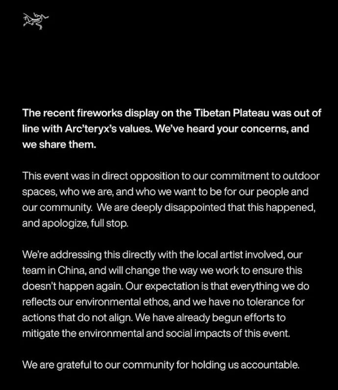 始祖鸟在海外平台Instagram上发布的声明中表示:近期在青藏高原举办的烟花表演与始祖鸟的价值观不符,我们已听到大家的关切,并且也深表认同。这一活动与我们对户外空间的承诺、我们的定位以及我们希望为民众和社区所扮演的角色背道而驰。我们对这一事件的发生深感遗憾,并在此郑重道歉。我们正在直接与涉事的当地艺术家、我们在中国的团队进行沟通,并且会改变我们的工作方式,以确保此类事件不再发生。我们期望我们所做的每一件事都能体现我们的环保理念,对于不符合这一理念的行为,我们绝不容忍。我们已经开始着手努力减轻此次活动对环境和社会造成的影响。我们感谢社区对我们的监督。