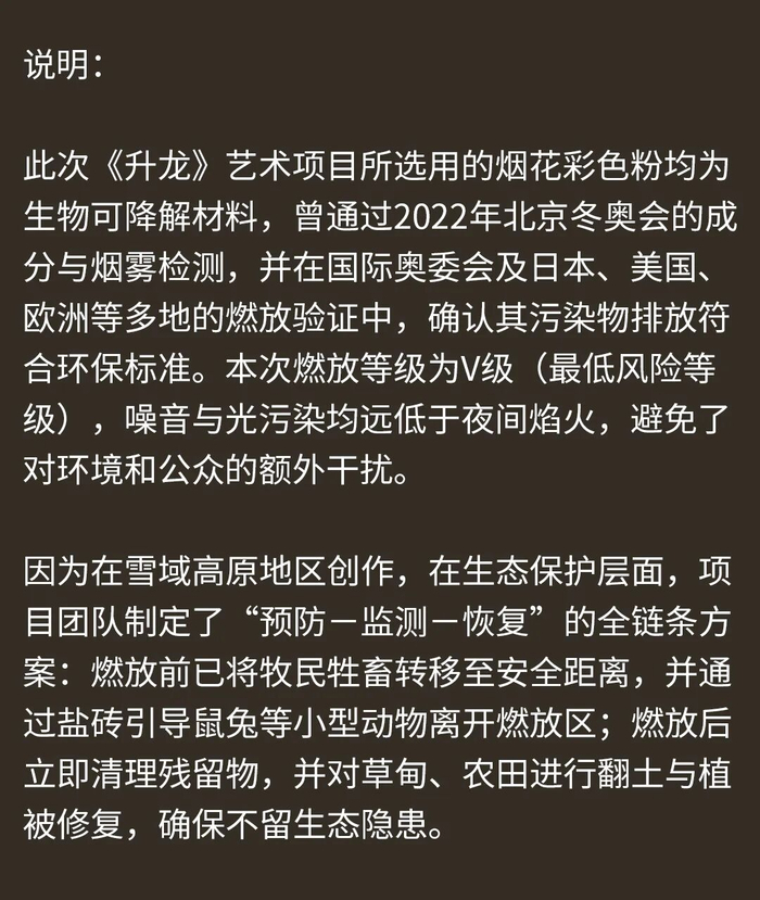 因为在雪域高原地区创作,在生态保护层面,项目团队制定了“预防一监测一恢复”的全链条方案:燃放前已将牧民牲畜转移至安全距离,并通过盐砖引导鼠兔等小型动物离开燃放区;燃放后立即清理残留物,并对草甸、农田进行翻土与植被修复,确保不留生态隐患。