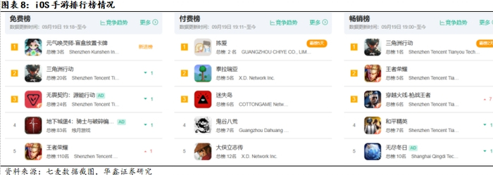 手机游戏方面,排行榜情况如下所示,免费榜排名前三的手游为《元气唤灵师·盲盒放置卡牌》、《三角洲行动》和《无畏契约:源能行动》,畅销榜排名前三的手游分别为《三角洲行动》和《王者荣耀》、《穿越火线-枪战王者》。