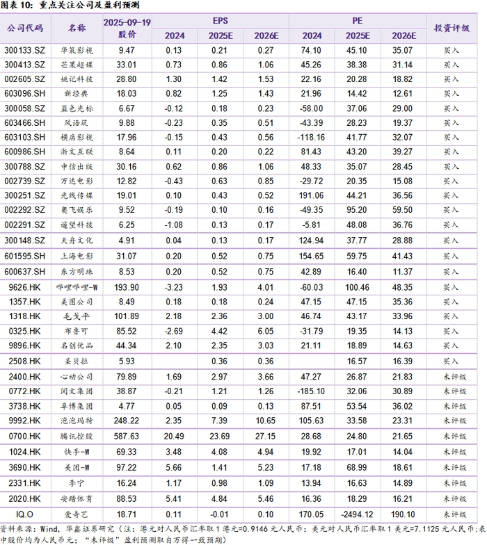 给予传媒行业推荐评级。A股可关注,东方明珠600637(通过股权投资方式受让超聚变数字技术有限公司股权);芒果超媒300413(新综艺《声鸣远扬》9月海选并将有望10月底开启直播);蓝色光标300058(ALL In AI战略见成效,战略投资PureblueAI清蓝,共同发力GEO市场);万达电影002739(暑假档后将迎国庆档关注影片《浪浪人生》,非票收入通过创新拉动创收);汤姆猫300459(《汤姆猫总动员2》成汤姆猫海外新晋主力产品,关注后续AI新品供给);奥飞娱乐002292(2025年9月推出员工持股计划受让价格为4.84元/股);中信出版300788(央企,大众阅读头部企业主业持续具韧性);华策影视300133(国庆档关注电影《刺杀小说家2》);姚记科技002605(关注卡牌板块热度拉动情绪);天舟文化300148(教辅与游戏双主业业绩增长);上海电影601595(电影《浪浪山小妖怪》拉动周边衍生品热销);横店影视603103(关注国庆档进展,下沉市场内需仍具潜力);风语筑603466(以具身智能驱动新文旅,借科幻赛道转战体验经济:携手三体宇宙,以“P+科技+商业”EPCO模式打造“体·未来学院”);浙文互联600986(全链路AI布局再迎发展新机遇,深耕“AI+营销”“AI+文化”“算力+融租”三大产业链);吉比特603444(《问剑长生》拟2025年第四季度在中国港澳台、韩国等地区上线;);港股可关注,B站9626(已开启双十一招商预热);腾讯0700(2025年8月新游《无畏契约:源能行动》表现优异);阿里9988(迎阿里云栖大会,推出高德扫街榜利);阜博集团3738(以数字内容收益开拓RWA新路径作);美图1357(推出AI Agent产品RoboNeo);布鲁可0325(关注后续新品进展);圣贝拉2508(以女性为支点撬动产后护理和修复市场,关注后续出海与AI的进展);名创优品9896(大店战略进展顺利,期待海外增量);毛戈平1318(10月将正式进驻香港海港城,持续期待公司海外拓展)。
