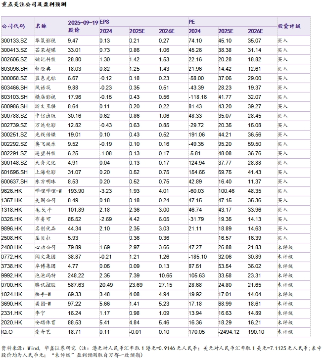 个股跟踪:A股可关注,东方明珠600637(作为国有文化传媒集团排头兵,AI时代有望开启增长新引擎,开启东方有线超高清AI升级行动,通过股权投资方式受让超聚变数字技术有限公司股权);芒果超媒300413(新综艺《声鸣远扬》9月海选并将有望10月底开启直播,与智元机器人合作联合研发“小玖”机器人并用于节目中);蓝色光标300058(ALL In AI战略见成效,战略投资PureblueAI清蓝,共同发力GEO市场,预计2025年年化AI驱动收入将实现30-50亿元,从ARR角度进行PS估值,有望带来市值增厚);万达电影002739(暑假档后将迎国庆档关注影片《浪浪人生》,非票收入通过创新拉动创收,万达电影IP售卖业务还储备《疯狂动物城》系列IP、初音未来、《小马宝莉》系列IP等);汤姆猫300459(《汤姆猫总动员2》成汤姆猫海外新晋主力产品,关注后续AI新品供给,同时数字营销业务也有望受益字节跳动产业链);奥飞娱乐002292(2025年9月推出员工持股计划受让价格为4.84元/股,看后续毛绒品类拓展,也将受益AI+陪伴赛道);中信出版300788(央企,大众阅读头部企业主业持续具韧性,夸父AI数智出版平台持续提质增效,IP运营与内容生态构建加速,IP相关图书如《哪吒·三界往事》《黑神话·悟空》《影神图》等);华策影视300133(国庆档关注电影《刺杀小说家2》,受益广电21条政策,布局算力已初见成效,投资加码短剧外,积极布局AI,间接投资智谱华章);姚记科技002605(看后续主业修复回暖进展,关注卡牌板块热度拉动情绪);天舟文化300148(教辅与游戏双主业业绩增长,新业务AI+教育可期,2025年7月推出AI练字教育产品);上海电影601595(电影《浪浪山小妖怪》拉动周边衍生品热销,也将受益IP+文旅赋能消费新场景);横店影视603103(关注国庆档进展,下沉市场内需仍具潜力,市占率仍具提升空间,借力横店的影视产业资源,加强文旅业务融合,推动构建影视产业生态新发展);;风语筑603466(作为数字展示龙头,风语筑正借EPCO模式强化品牌科技文化影响力,加速拓展数字文旅新场景打造体验经济;2025年7月打造的文旅在水一方科幻馆有望成为行业标杆文化新品,以具身智能驱动新文旅,借科幻赛道转战体验经济:携手三体宇宙,以“P+科技+商业”EPCO模式打造“体·未来学院”);浙文互联600986(全链路AI布局再迎发展新机遇,深耕“AI+营销”“AI+文化”“算力+融租”三大产业链,全面推动人工智能从技术研发向场景应用与产业落地转化,着力构建“技术-场景-产业”全链路闭环生态);港股可关注,B站9626(已开启双十一招商预热,2025年业绩有望持续向好,以优质内容为支点也是创越周期的核心,社区视频商业价值有望再升);腾讯0700(2025年8月新游《无畏契约:源能行动》表现优异,关注AI驱动内容进展);阿里9988(迎阿里云栖大会,推出高德扫街榜,加码AI与消费,以AI为支点撬动时代红利);阜博集团3738(作为全球领先的数字内容保护与交易服务提供商,香港发布条例,阜博集团以数字内容收益开拓RWA新路径作);美图1357(推出AI Agent产品RoboNeo,将进一步以AI技术打造世界级的产品,更好去服务生活场景与生产力产品用户的垂直需求);布鲁可0325(关注后续新品进展);圣贝拉2508(以女性为支点撬动产后护理和修复市场,小红书的另一种表达,2025年上半年业绩增长向好,关注后续出海与AI的进展);名创优品9896(大店战略进展顺利,期待海外增量);毛戈平1318(10月将正式进驻香港海港城,持续期待公司海外拓展)。