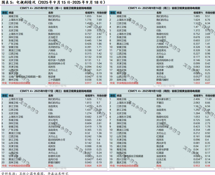 电视剧方面,收视率如下图所示,周度收视率靠前的电视剧为湖南卫视的《我们的河山》、江苏卫视的《归队》和浙江卫视的《浴血荣光》。